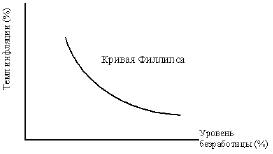 Принято считать, что между безработицей и уровнем инфляции в краткосрочном периоде существует обратная зависимость. Т.е. высокая инфляция сопровождается относительно низким уровнем безработицы, и наоборот. На графике это выглядит так.