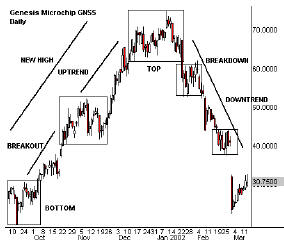 Что это за повторяющиеся циклы? Они соответствуют обычным понятиям технического анализа, которые мы знали все эти годы - основания, прорывы вверх, восходящие тренды, новые максимумы, вершины, прорывы вниз и нисходящие тренды. Каждая стадия также определяет ось трендового диапазона, которая ведет цену в боковом движении, вверх или вниз в достаточно предсказуемой манере.