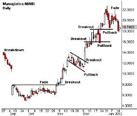 Максимальная возможность возникает в момент перехода от одной стадии к другой. Возьмем три примера. Возможность торговли на прорыве появляется, когда основание переходит в восходящий тренд. Торговля на откате развивается в тот момент, когда цена восстанавливается к границе последней стадии. Рывок к новым максимумам порождает спектр импульсных сделок.