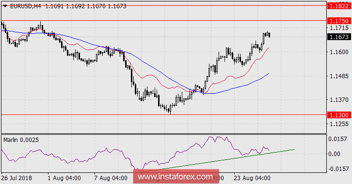 В понедельник евро продолжил пятничную тенденцию роста и технически перешел индикаторную линию баланса. Преодолев последнее препятствие к дальнейшему продвижению вверх. Теперь перед ценой две ближайшие цели. Это 1.1750 – три максимума второй половины июля. И 1.1822 – уровень Фибоначчи 161,8% от первой ветки роста.
