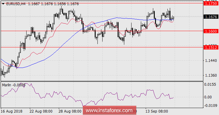 Итак, общий настрой рынка вверх, цель 1.1750, далее 1.1832. Движение вниз также может быть, так как на Н4 ситуация нейтральная. В этом случае цена может найти поддержку на линии баланса по daily – 1.1600. Причиной снижения может послужить платёжный баланс еврозоны, публикуемый сегодня в 11:00 мск, прогноз за июль составляет 22,4 млрд евро против 23,5 в июне.