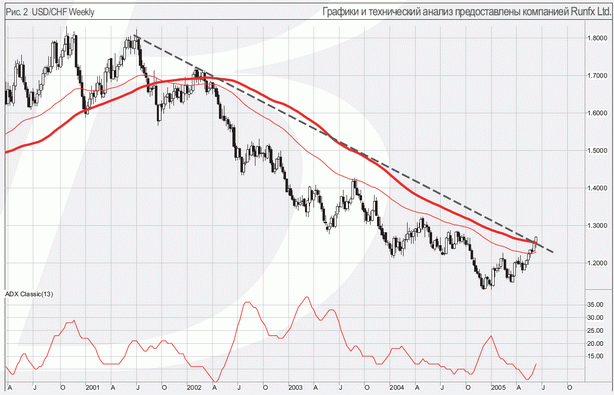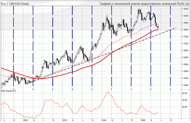 Мы считаем что фунт в ближайшие пару недель вырастет в цене. Нынешняя неделя вероятно закончится на уровне 1,84, так как, кажется, отсутствует третья корректирующая волна (интрадэй) вверх. После этого, скорее всего повышение доллара продолжится, так как цены находятся на 150 пунктов над недельным 100-периодным скользящим средним (см.рисунок). Так же может быть протестирована и линия тренда в среднесрочной (а возможно и в краткосрочной) перспективе.