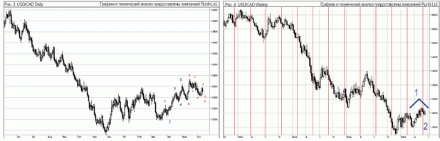 Евро достиг обозначенного нами уровня 1,2100 (1,2105). Очевидно, что скорее всего стоит ожидать спадов ниже этого уровня (осталась предположительно еще одна волна интрадэй), хотя в ближайшее время мы уже точно будем знать, каковой окажется реакция на уровень 1,2000. Если 4-я волна начнется за фигуру до этого уровня, то это будет означать существенное замедление тренда по сравнению с текущей скоростью. Конечно, если произойдет кратковременный прорыв самого уровня, стоит ожидать высокой волатильности в последующих колебаниях.