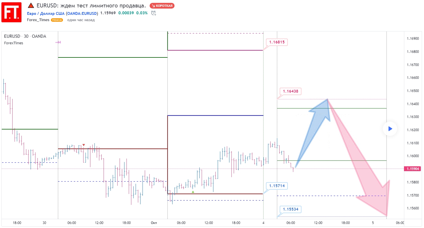 В случае пробоя и закрепления ниже уровня убытка маркетмейкера (1.1571) конечной целью снижения до закрытия торговых суток выступает лимитный покупатель (1.1553).