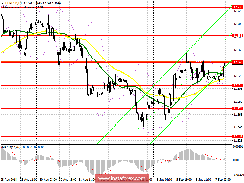 Покупателям в паре EUR/USD необходимо закрепление выше сопротивления 1.1646, что приведет к более крупной восходящей волне в район 1.1686 и 1.1730, где рекомендую фиксировать прибыль. В случае снижения евро в первой половине дня, к покупкам можно возвращаться на ложном пробое от уровня поддержки 1.1610 либо открывать длинные позиции сразу на отскок от 1.1574.