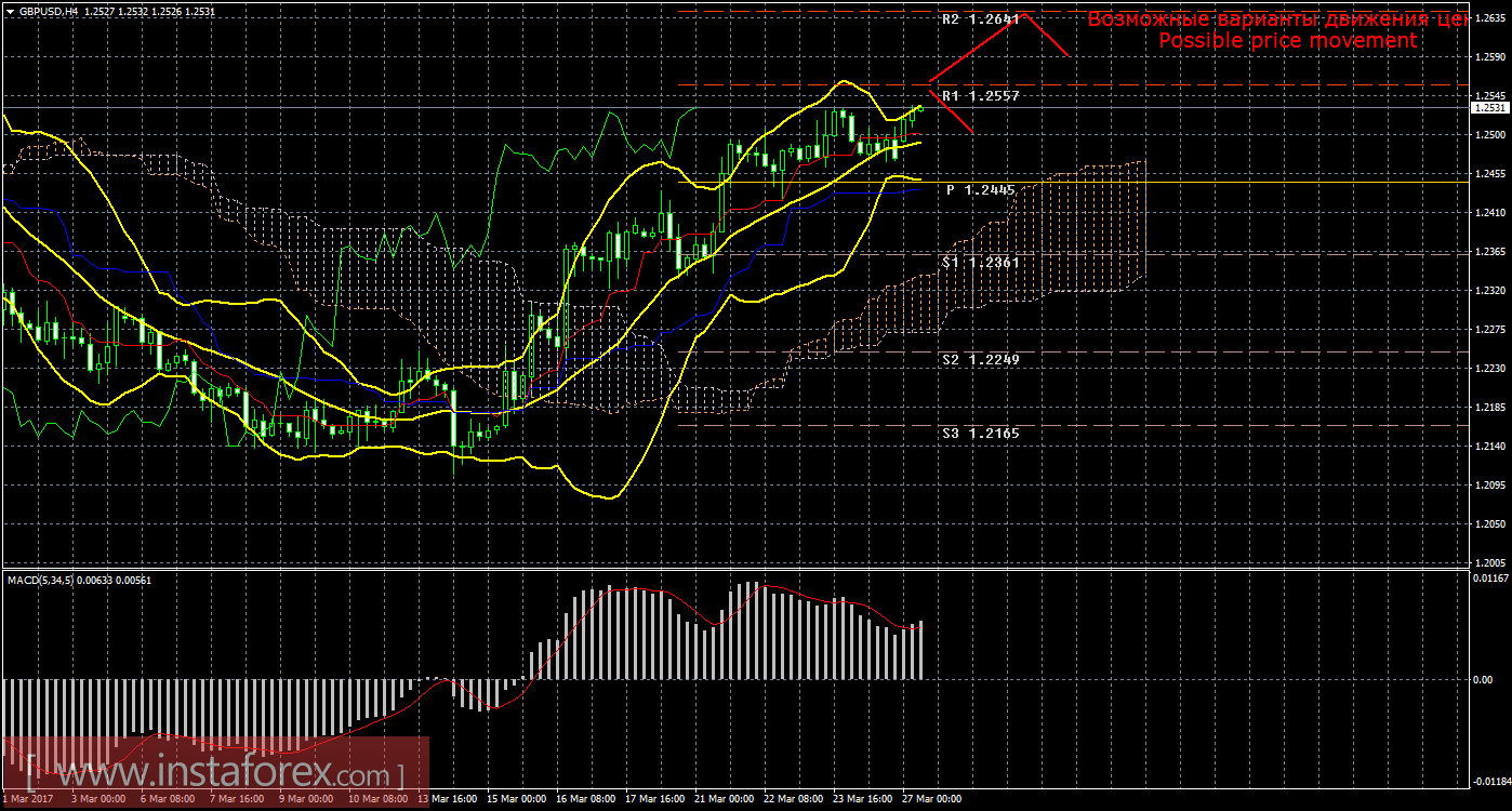 Движение вниз сможет попытаться продолжиться с целью пивот уровень 1,2445, а лонги потеряют свою актуальность. Боллинджер Бандс показывает продолжение восходящего движения, полосы вновь расширяются и направлены наверх, поэтому сейчас на рынке остаются актуальными длинные позиции. MACD развернулся вниз, сигнализируя о текущем нисходящем движении. Разворот индикатора наверх укажет на завершение нисходящей коррекции. Отскок цены от линии Киджун-сен также может спровоцировать окончание витка коррекции.