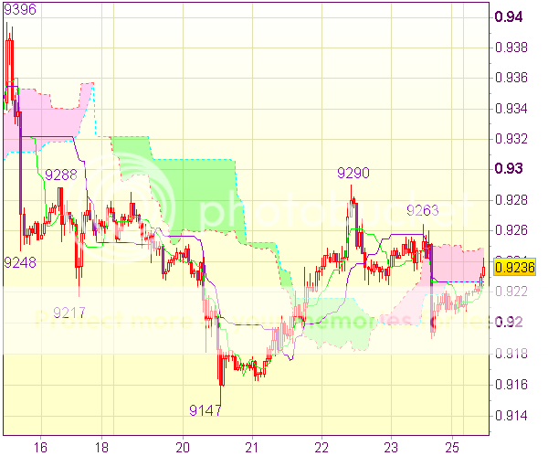 В ходе торгов в пятницу доллар просел от 0,9263 до 0,9190. Тем не менее, учитывая, что минимум был образован на 0,9147, далее возможен этап консолидации с мягким уклоном вверх. Прорыв 0,9263 может привести к тестированию 0,9290 (максимум прошлой недели), чей пробой может открыть паре путь к 0,9300-05 и 0,9330-40. Однако сопротивление 0,9370 должно ограничить восходящую волну, и курс, вероятно, будет колебаться ниже 0,9396.