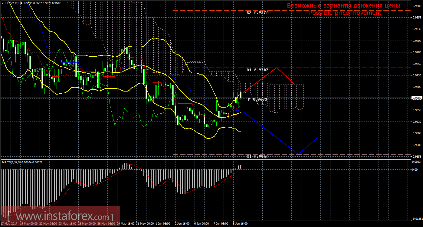 Восходящее движение имеет перспективы только выше линии Киджун-сен (0,9655), если цена закрепится ниже этой линии, то «золотой крест» будет поставлен на грань отмены, а восходящее движение – потеряет свою актуальность, движение вниз сможет возобновиться с целью уровень поддержки 0,9560. Боллинджер Бандс показывает начало восходящего движения, полосы расширяются и направлены вверх, поэтому сейчас на рынке актуальны варианты лонгов. MACD направлен вверх, что сигнализирует о восходящем движении цены, разворот индикатора вниз просигнализирует о витке коррекционного движения. Отскок цены от линии Сенкоу Спан Б или первого таргета также может спровоцировать нисходящую коррекцию.